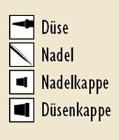 Für die Airbrushpistolen AMI 200 und AMI 300 sind jeweils Lieferbar: Nadel / Düse / Nadelkappe / Düsenkappe.