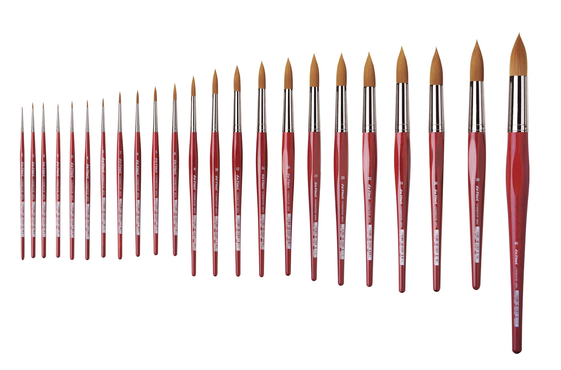 Aquarellpinsel aus extrafeinen, sehr geschmeidigen hellbraunen Synthetikfasern. Kurze, rot lasierte Esagonalstiele. Nahtlose Silberzwinge aus vernickeltem Messingrohr.
