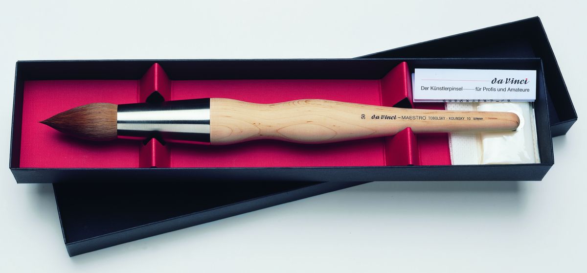 Diese Pinselpersönlichkeit, ein Kolinsky- Rotmarderpinsel in der abgebildeten Originalgröße ist ein Meisterwerk der Pinselmacher von da Vinci. Die Erfahrung von Generationen schaffen die