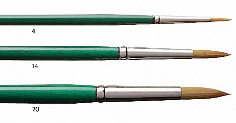 Runder Ölmalpinsel aus feinsten, goldfarbenen Synthetikfasern. Lange, grün lackierte Stiele. Nahtlose Silberzwinge aus vernickeltem Messingrohr.