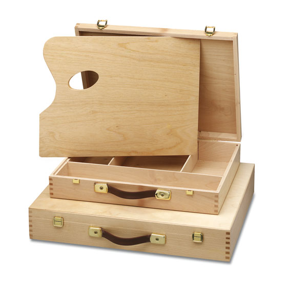 Extragroßer Malerkoffer aus Buche mit einer Holzpalette.