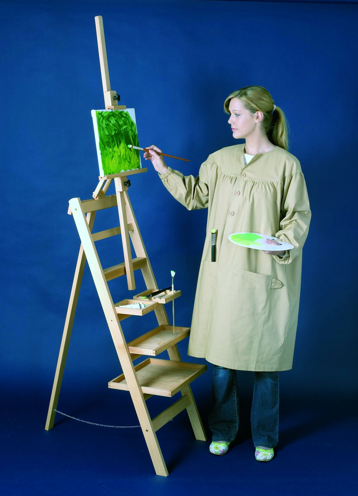 Baumwollkittel im Stiele der französischen Impressionisten. Sehr bequem geschnitten mit Taschen für Pinsel und Malerutensilien. In der Waschmaschine waschbar.