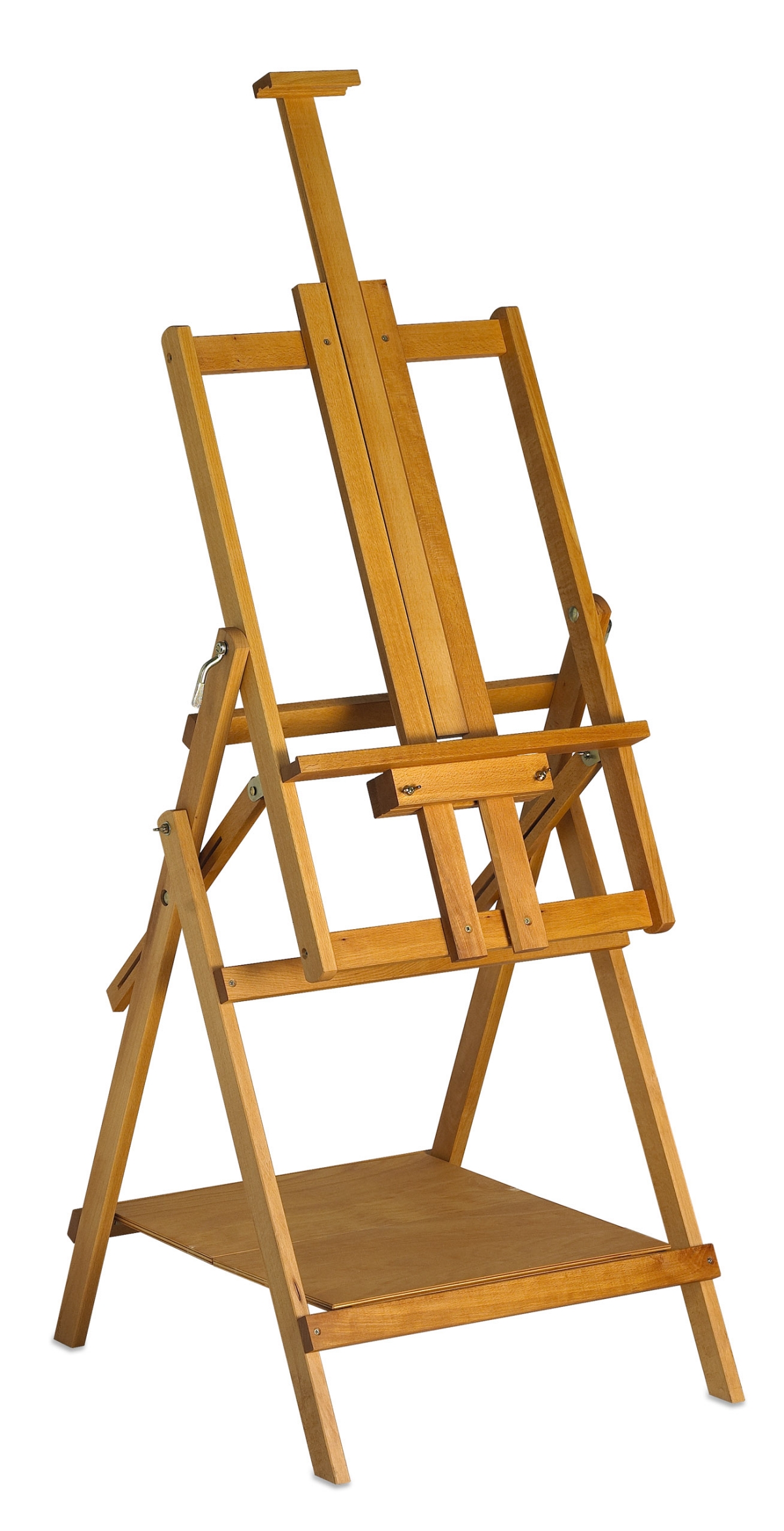 Handwerklich gut verarbeitete Staffelei aus geöltem Buchenholz mit stabilen Beschlägen. Klappbarer Bodenträger als Ablage für Malutensilien. Die Staffelei ist stufenlos von senkrecht bis waagerecht verstellbar, daher auch als Aquarellstaffelei geeignet.