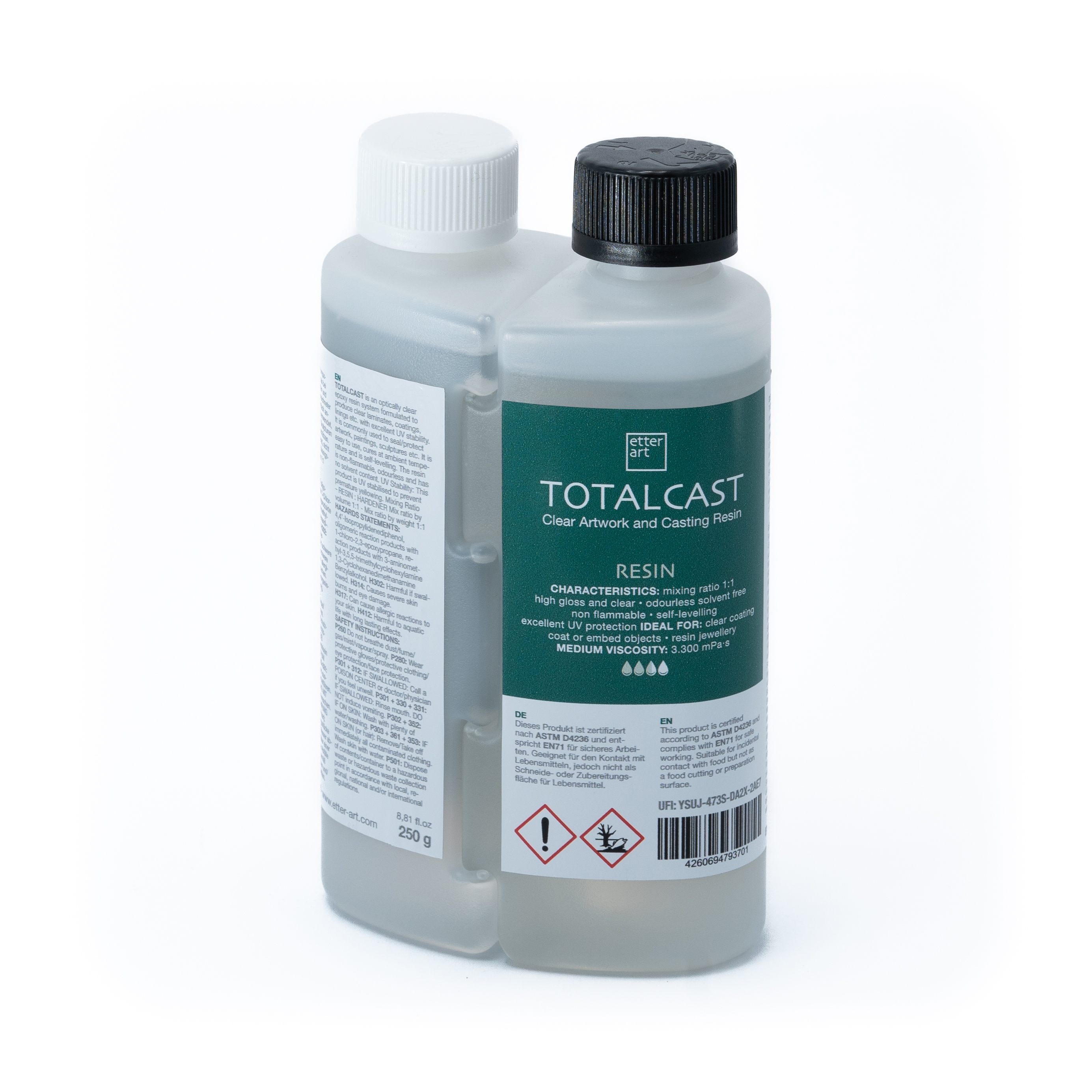 TOTALCAST wird beim Vermischen seiner beiden Einzelkomponenten zu einem harten und glasartigen Lack. Zudem bietet es bestmöglichen Schutz vor Vergilbung. Dafür sorgen sogenannte UV-Stabilisatoren: Diese Produkte enthalten einen UV-Absorber und HALS (Hindered Amine Light Stabilizer), die einem Vergilben maximal vorbeugen. TOTALCAST ist besonders gut geeignet, wenn man etwas beschichten oder einbetten (eingießen) möchte. Die eher kurze Verarbeitungszeit von bis zu 20 Minuten hat den Vorteil, dass das Objekt schneller härten und dadurch weniger anfällig für staun oder äußerer Einflüsse sind.