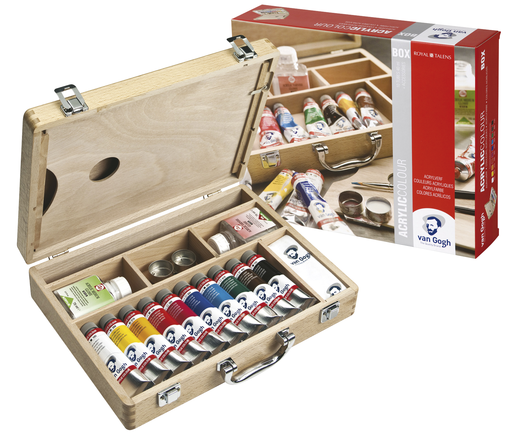 Stabiler, heller Holzkasten gefüllt mit 10x40ml Tuben Künstler-Acrylfarbe der Sorte van Gogh. Dazu gibt es reichlich Zubehör: - je 1 Glas Acrylmalmittel 75ml in matt und glänzend, 1x Van Gogh Pinsel Serie 294 Nr. 10 und 1x Van Gogh Pinsel Serie 295 Nr. 6, einen doppelten Palettenstecker, eine Holzpalette und ein Reinigungstuch.
